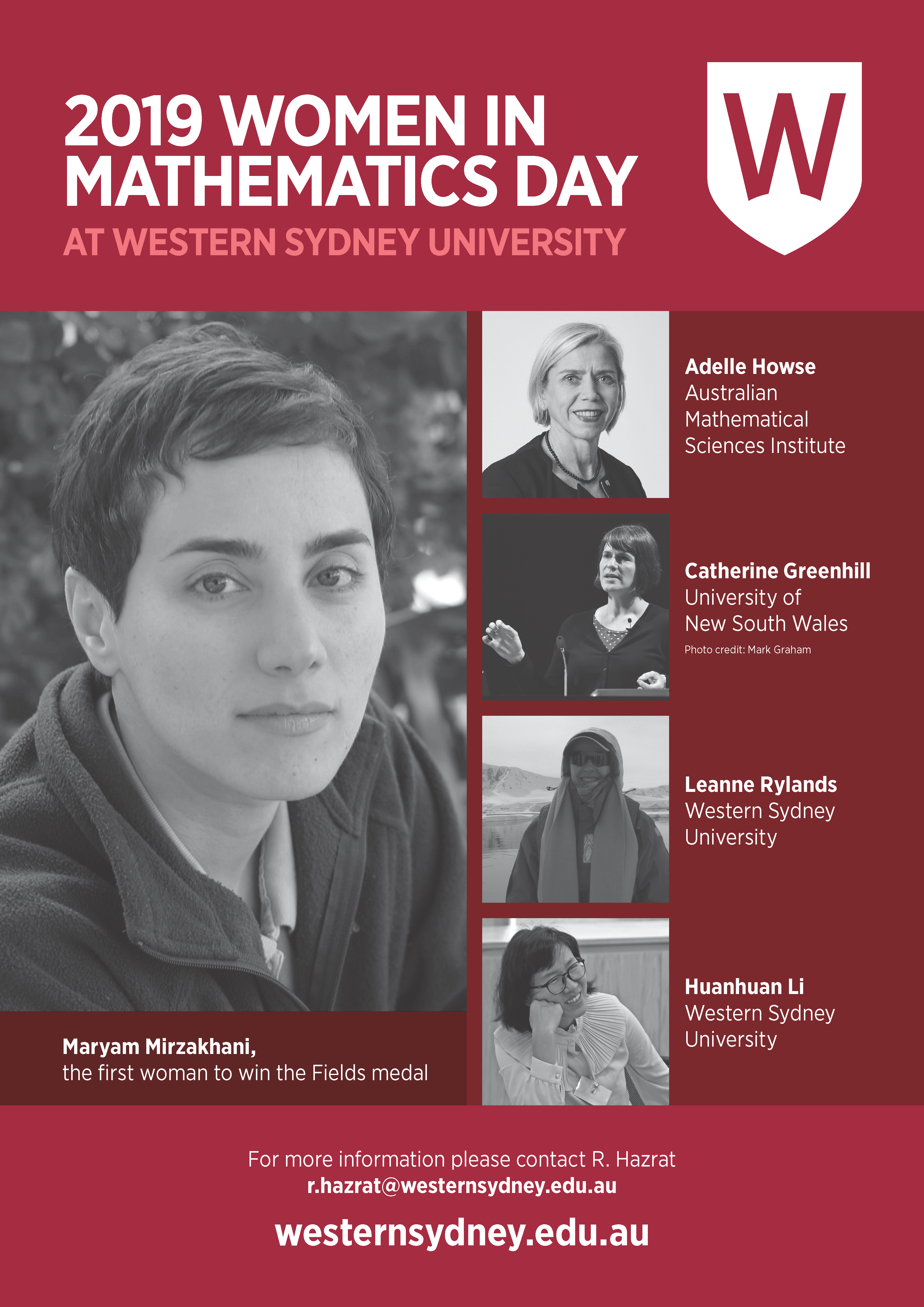 The first Women in Mathematics Day in Western Sydney was held on the 16th of May 2019 to celebrate the achievements and contributions of women active in Mathematics. The day is around Maryam Mirzakhani’s birthday, who was the first ever woman who won the Fields medal. The event consists of several invited talks given by mathematicians active in Western Sydney and other institutes in Australia.