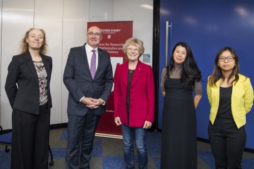 associate professor Leanne Rylands, Vice Chancellor Barney Glover, speakers: Cheryl Praeger, Susan Wei, Natalie Thamwattana